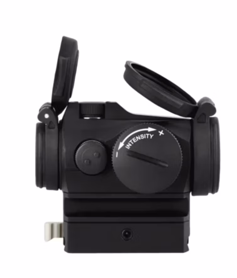 - Linsskydd: Utrustat med uppfällbara linsskydd där den främre delen är solid och den bakre delen genomskinlig, vilket möjliggör skjutning med båda ögonen öppna under kritiska situationer.