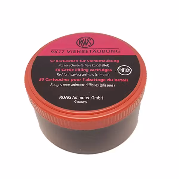 RWS 9mm Röd slaktpatron – för hästar, äldre oxar & tjurar. 9x17mm kaliber, 50-pack. Maximal kraft för säker och human avlivning.