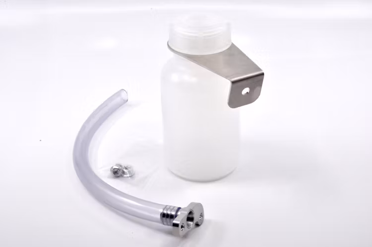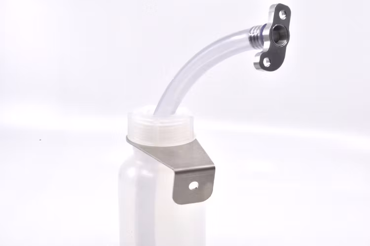 Primer chute for spent primers replaces the blue plastic spent primer cup and bracket on the Dillon 650 reloading press. It completely covers the spent primer ejection port, creating a fully enclosed pathway for spent primers. Spent primers are routed through clear PVC tubing into plastic bottle which you fix with a holder on a strong mount. No more spent primers on floor.