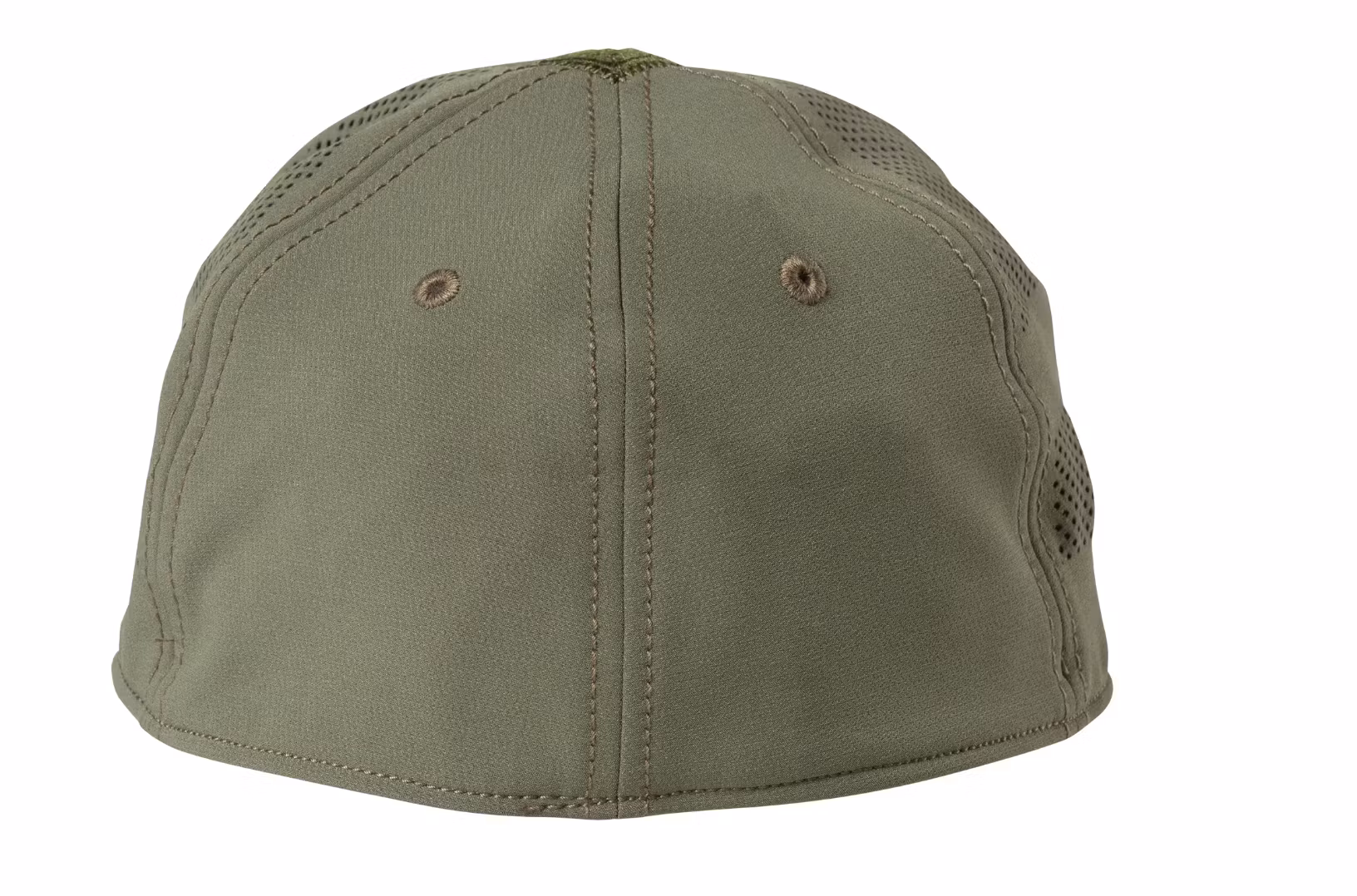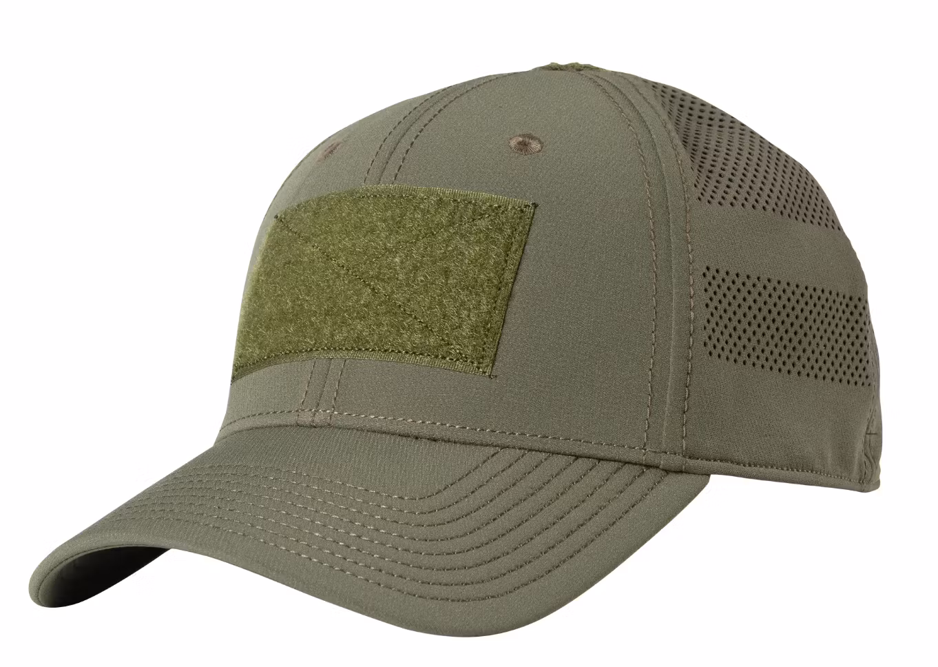 - 5.11 logos at side brim, at top of crown, and on sweatband