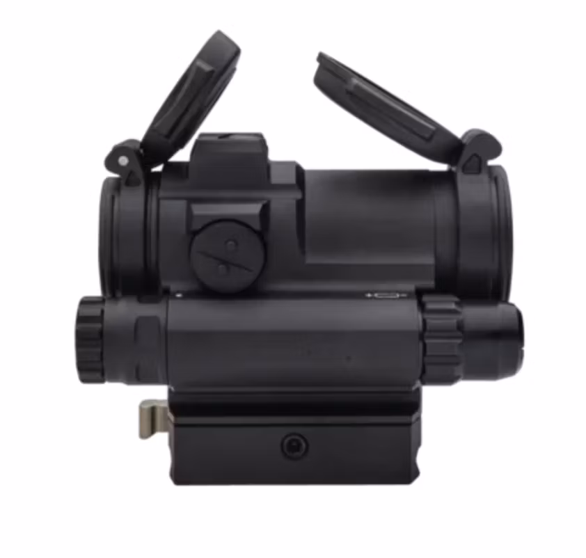 - Optisk Design: CompM5s är utrustad med uppfällbara linsskydd där framsidan är solid och baksidan genomskinlig. Detta tillåter skyttar att skjuta med båda ögonen öppna även i en nödsituation med linsskydden stängda.