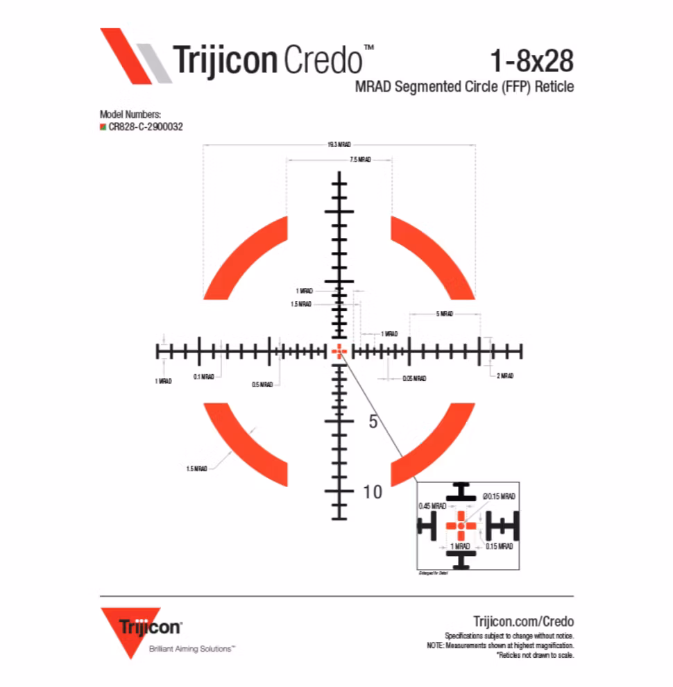 Get rapid target engagement and long-range precision from the same riflescope—the Trijicon Credo® 1-8x28. A favorite among competitive shooters and tactical users, this is our finest low power variable riflescope. The Credo 1-8x28 gives you fully multi-coated, broadband, anti-reflective glass, a 34mm tube and a 28mm objective lens for improved exit pupil and low light performance. The dual red/green illuminated MRAD Segmented Circle reticle is designed for CQB and distance shooting in any environment. Shoot with confidence.