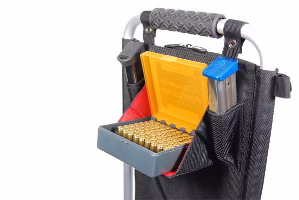 The D1000 fabric backing is as functional as it is attractive. On the front top end, positioned high for easy access while standing, is a fold-out ammo shelf, on which you can place 100 rounds of ammo and load your magazines comfortably. A great feature for those ranges without tables! Beside this fold-out tray are a couple of extra magazine pockets, for added convenience.