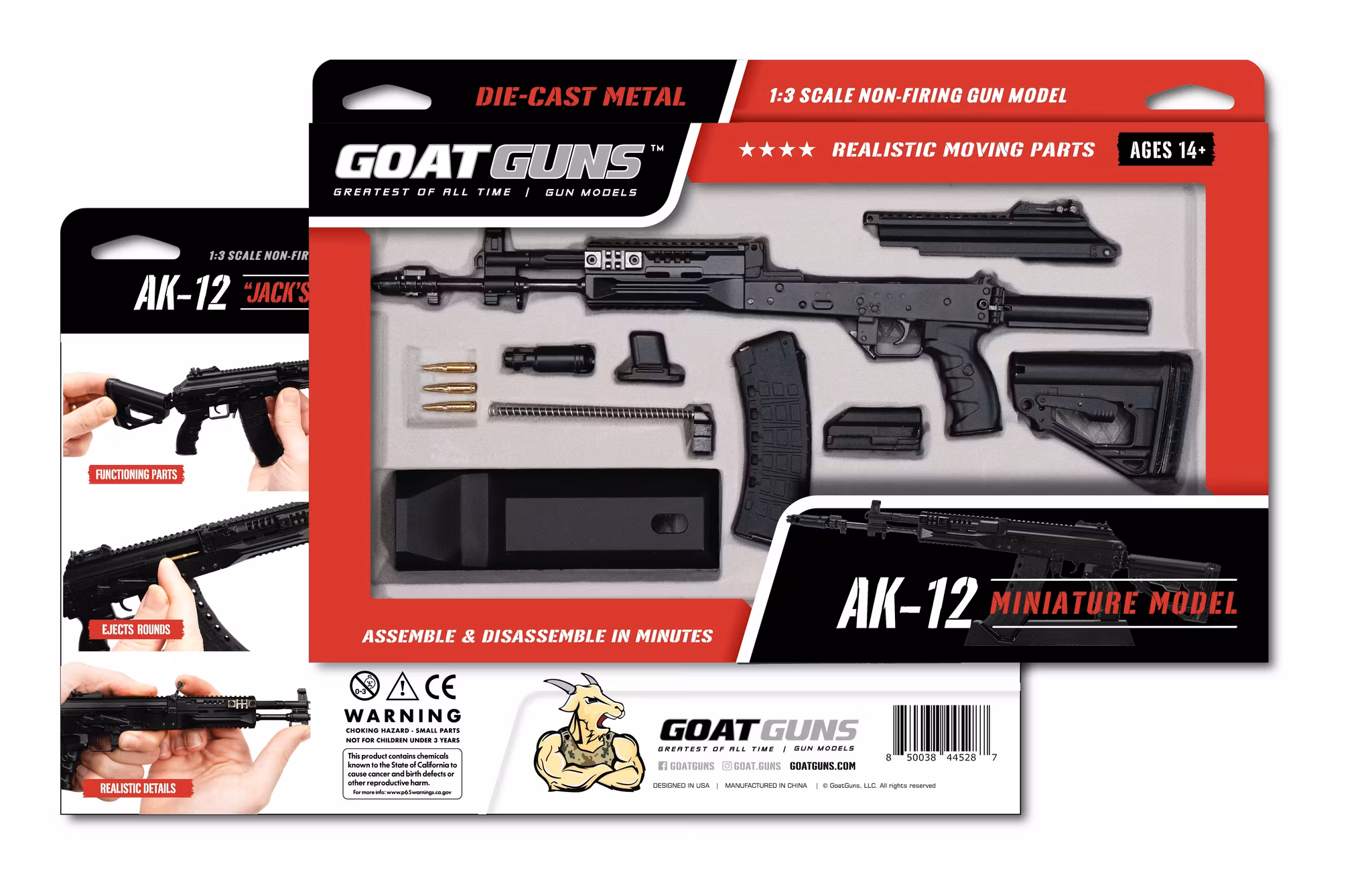 GoatGuns introducerar sin miniatyrreplika av AK12, en moderniserad version av det klassiska AK47-geväret. Denna högkvalitativa och autentiska miniatyr i svart u