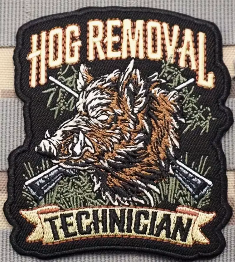Hog Removal Technician-tygmärke – slitstark brodyrpatch för jägare och lantbrukare. Enkel montering på jacka, keps eller väska. Visa din expertis!