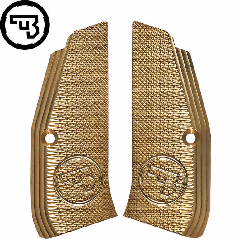 Mässings-kolvsidor till CZ75. Passar bland annat Shadow (utan mag.brunn).Checkerade för bättre grepp.