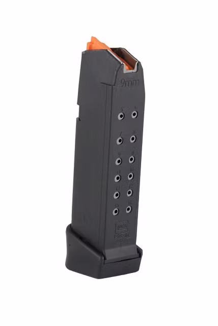 Högkvalitativt magasin för Glock 19 (9×19) med 15+2 kapacitet och orange follower för snabb visuell kontroll. Designat för pålitlig matning, enkel rengöring och