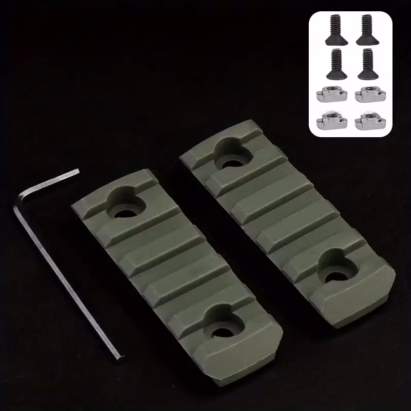 Picatinny Rail med 5 slots i grön färg, tillverkad av slitstark polyamid (PA, nylon), är en kompakt och mångsidig tillbehörsskena som kan fästas på din taktiska utrustning. Denna rail är idealisk för montering av tillbehör som sikten, lampor eller andra taktiska tillägg på en kompatibel Picatinny-skena. Med sin robusta konstruktion och lätta design är den både hållbar och funktionell, perfekt för att anpassa din utrustning efter behov.