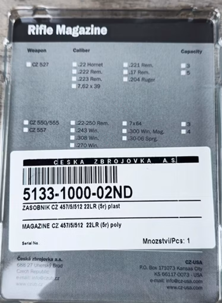 Magasin CZ 457/5/512 22LR (5r) polymer är ett slitstarkt och pålitligt 5-skottsmagasin tillverkat i robust polymer, speciellt designat för användning med C
