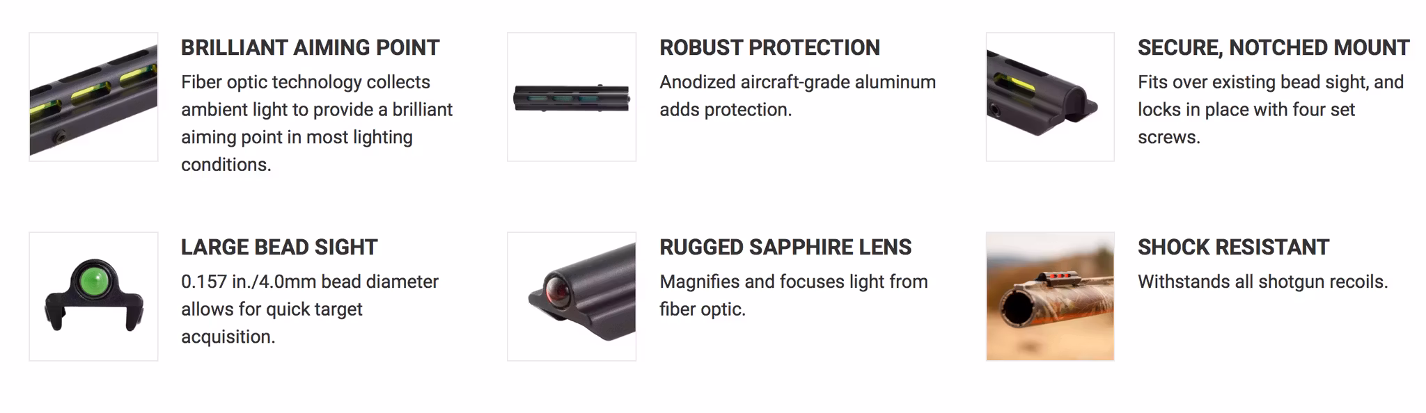 A simple but effective bead sight specifically designed to fit .210 – .280 in wide barrel rib shotguns, including popular names such as Benelli, Beretta, Browning and Winchester. The green fiber optic shotgun sight collects ambient light to provide a brilliant aiming point in a wide range of lighting conditions. The fiber is capped with a sapphire jewel to help evenly distribute the light. This bright and rugged sight is ideal in tactical and defense roles and can also serve well in hunting applications, including upland game, waterfowl and turkey. Constructed of anodized 6061-T6 aluminum, it’s built to withstand shotgun recoil, white-hot barrel temperatures and years of field use.