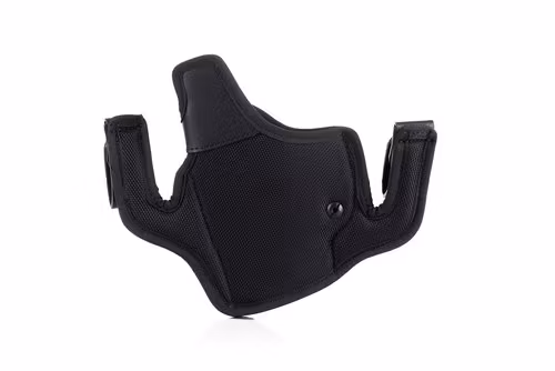 A hybrid holster that can be used as both, IWB and OWB. made of premium quality nylon in combination with black leather. The main body is made of sturdy, shape-holding nylon where we reinforced the top of the holster with black leather and added the thumb break for those in a need of extra security of their holstered gun. Wearing is most comfortable in a straight position. The design ensures the holster would remain open, enabling easier and quick reholstering. Not to mention the smooth gun draw. The holster also features integrated plastic sights rail for top sights protection and sweat guard separating the gun from the body.