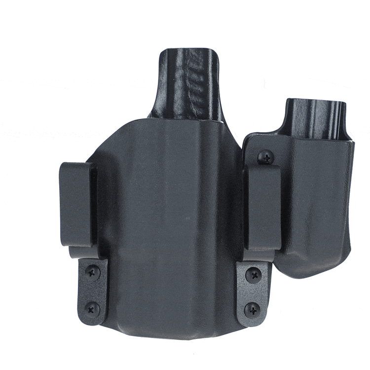 Open top Kydex belt holster with built-in magazine pouch designed for concealed appendix carry. The A904 holster keeps your firearm and spare magazine safely in place and provides outstanding retention, durability, and smooth draw. The two strong belt clips make the holster easy to mount and allow your shirt to be tucked in.