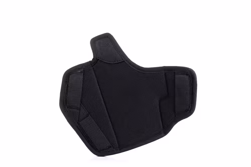 Pancake style belt OWB nylon holster with three belt loops allowing you to change the holster cant. Suitable for more on the back or cross draw carry. The main holster body is made of sturdy, shape-holding premium nylon where we reinforced the top of the holster with black leather. The holster design ensures the holster would remain open, enabling easier and quick reholstering. Not to mention the smooth gun draw. The holster also features integrated plastic sights rail for top sights protection and an optional sweat guard that separates the gun from the body.