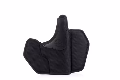 Pancake style belt OWB nylon holster with four belt openings allowing you to change the holster cant. Suitable for more on the back or cross draw carry. The main body is made of sturdy, shape-holding nylon where we reinforced the top of the holster with black leather and added the thumb break for those in a need of extra security of their holstered gun. The holster design ensures the holster would remain open, enabling easier and quick reholstering. Not to mention the smooth gun draw. The holster also features integrated plastic sights rail for top sights protection.