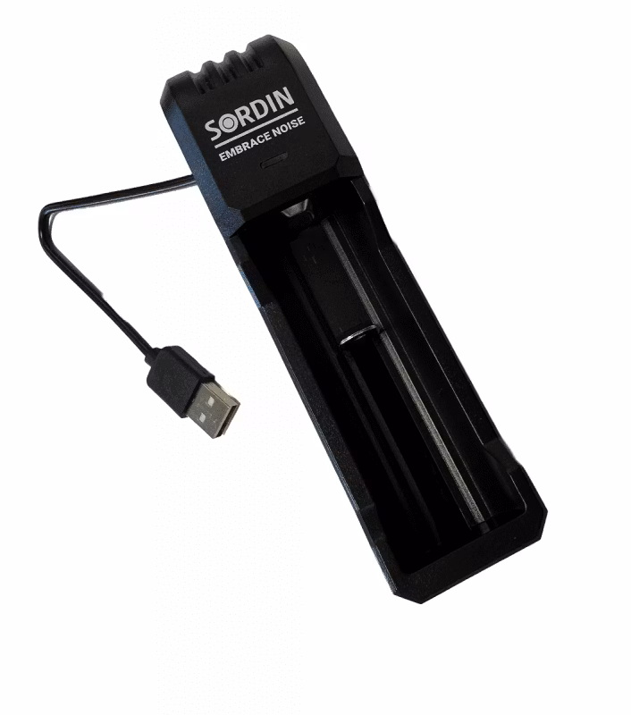 Kompakt laddare från Sordin för 14500 och 18650 Li-ion-batterier. Laddstatus via LED. Perfekt för jakt, skytte och taktisk utrustning.