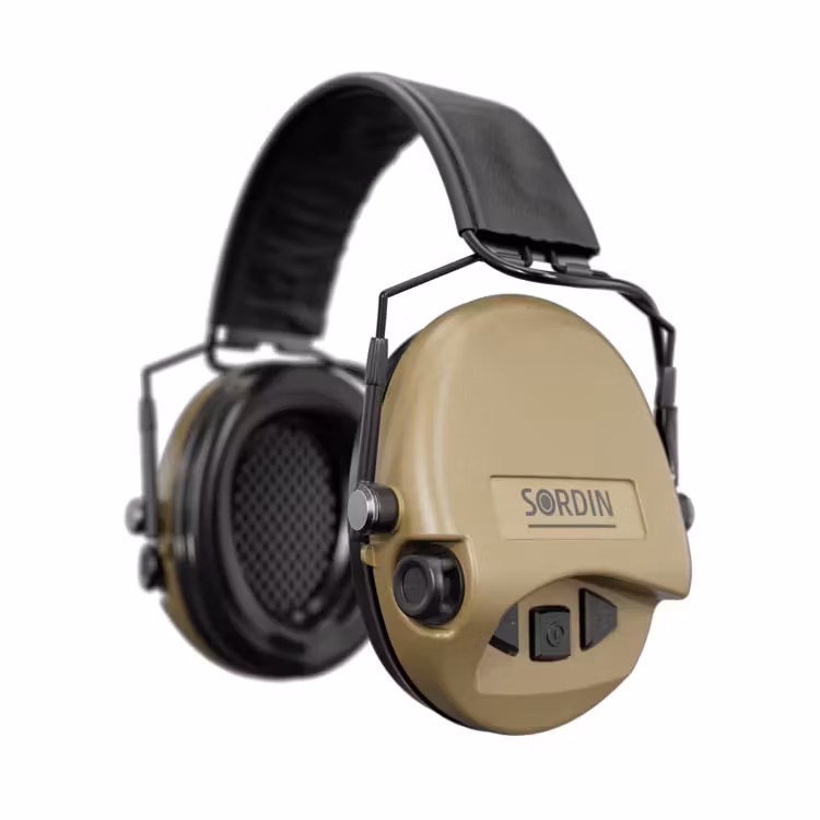 Sordin Supreme MIL AUX Slim Headband Sand – taktiskt headset med hög dämpning, dubbla högtalare, AUX-ingång och MIL-STD-certifiering. Slimmad design för skytte.