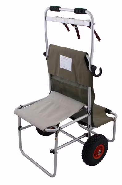 The Multi Rolly, unlike the Beach Rolly, has a transport platform in ADDITION to a folding seat. This means you can leave your range bag high and dry while you sit. The chair offered by the Multi Rolly is higher and therefore more comfortable to use, especially when wearing your rig.