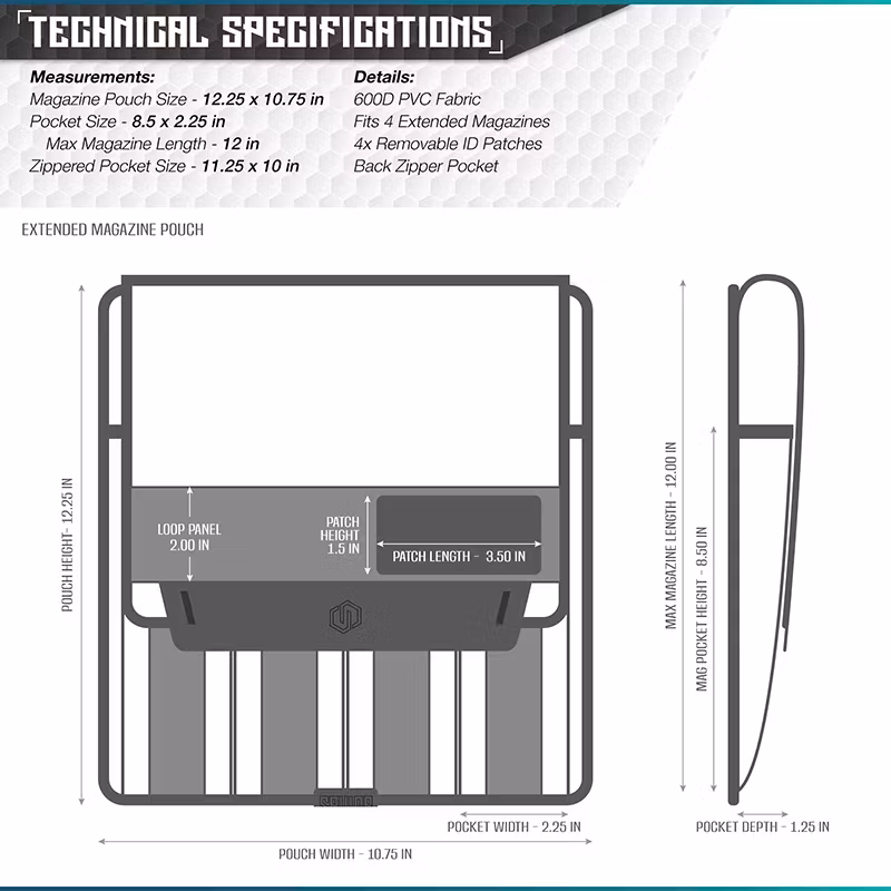 - Magasinfickans mått: 8.5" H x 2.25" W