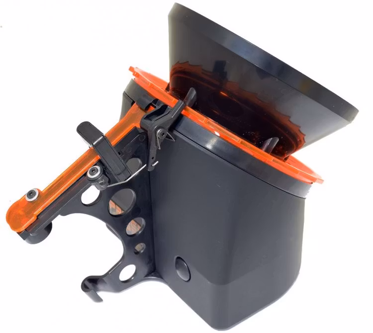 One of the most innovative design solutions of the PRIMER-PRO is the Output Actuator Arm, which is activated by a lever system off the Timing Disk at the bottom of the Collator Assembly. This Output Actuator Arm slides the primers from the bottom of the ramp slide, moving them over to above the output hole, holding them there for a split second to ensure they are static, horizontal and stable, and then retracting to allow the primer to fall cleanly down into the awaiting primer tube. This dynamic solution for the exit hole greatly reduces the chance of primers hanging up while exiting into the tube, a problem common with other automated primer fillers.