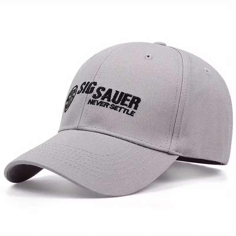 Grå Sig Sauer-keps med broderad logga, justerbar passform och förböjd skärm. Perfekt för skytte, vardag och friluftsliv.