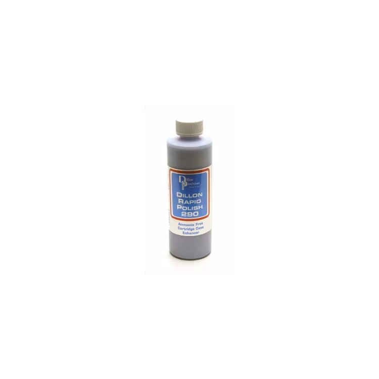 SHINE? You bet your brass! Dillon Precision has developed another exciting new product to make your reloading faster and easier. Rapid Polish 290 is the first cartridge case finish designed specifically to bring a brilliant shine (20 percent brighter than tumbling media alone) and a protective coating to reloaded ammunition. Simply add several capfuls to the media in your tumbler and run. Rapid Polish 290 has a great residual value and stays in your tumbling media. You'll use less each time you clean your cases.