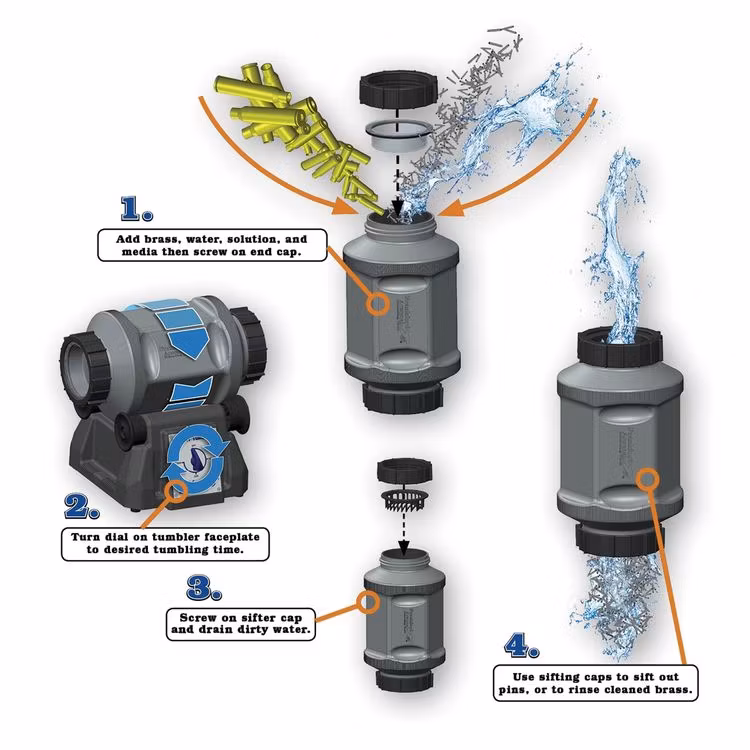 Frankford Arsenal Rotary Tumbler Kit är det mest avancerade systemet för hylsrengöring på marknaden. Med hjälp av rostfria stålpinnar och vätska rengörs både insidan och tändhattsfickorna till ett nära nyskick – snabbare och mer noggrant än traditionella metoder.