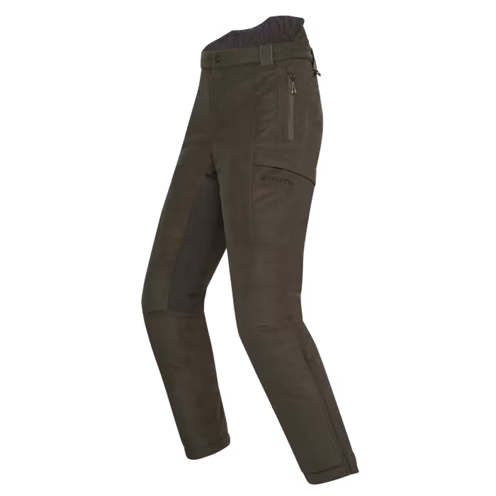 Den varma 120 g syntetiska vadderingen säkerställer optimal isolering, medan yttermaterialet, behandlat med Durable Water Repellent (DWR), är gjort av ljudlös polyester-gaze. Stretchpaneler på insidan av benen garanterar maximal rörelsefrihet, vilket gör dem idealiska för aktiva jaktscenarier.