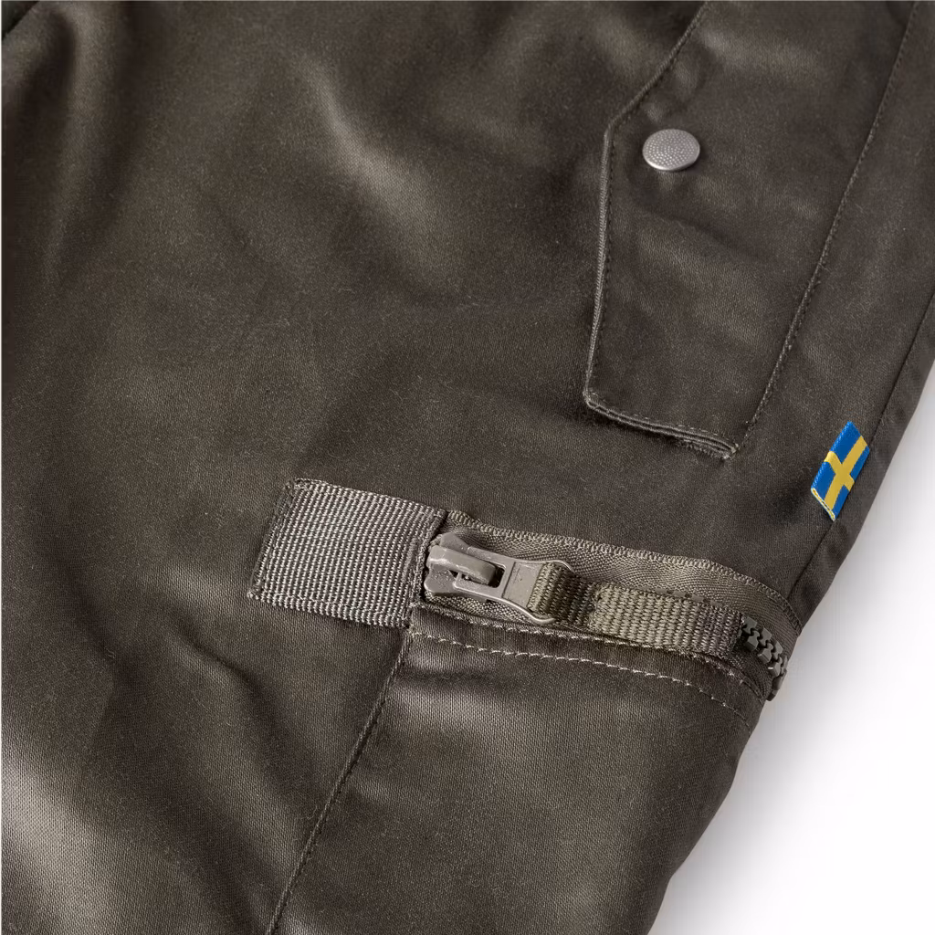 M90 byxa, Fältbyxa 90 är kopia av försvarets fältuniform i grön varpsatin 50%bomull/ 50% polyester 310g. Tyget är impregnerat mot vatten. Byxan har sidfickor med lock som stängs med tryckknappar. Benfickor och gylf stängs med blixtlås. Nedtill finns ett band med tryckknapp för hakning i skosnörningen. Byxbenen har bensprund som stängs med blixtlås. Midjan stängs med knapp. Byxorna har 7 hällor för livrem. En praktisk och slitstark byxa att använda i skog och mark.