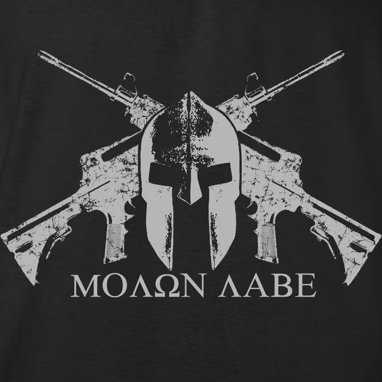 Front Print Distressed T-ShirtOur classic MOLON LABE shirt. Graphite-gray screen print on ever popular Black T-shirt!Molōn labe! (Μολὼν λαβέ; approximate Classi
