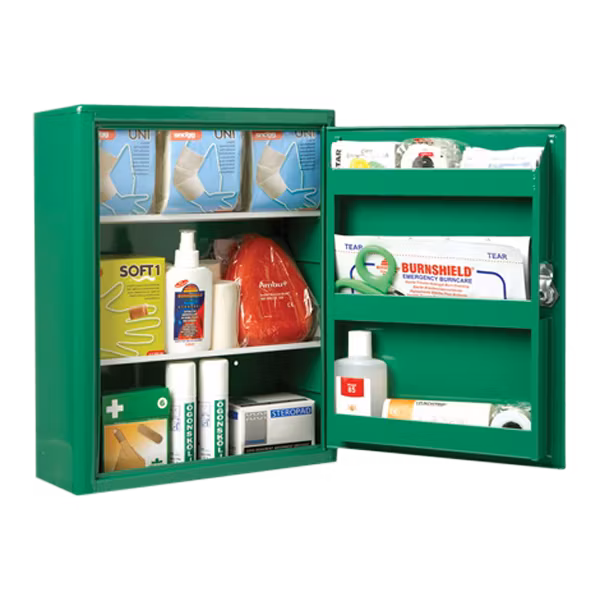 Dahl Förbandsskåp i plåt är ett robust och oerhört komplett Första Hjälpen-skåp. Innehåller det som behövs vid akuta olycksfall samt daglig förbrukning.Grönlack