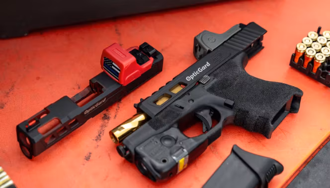 OpticGard Siktesskydd är specialdesignat för Trijicon® RMRcc och erbjuder skydd mot vilsekomna tomhylsor och repor. Det smarta snittet gör att skyddet passar de flesta bakre sikten och ljuddämpare. Skyddet inkluderar även en avtagbar träningslins, vilket möjliggör användning av rödpunktsiktet även i soliga eller ljusa områden. Våra siktesskydd är tillverkade av TPU (Termoplastiskt Polyuretan), vilket ger ett robust skydd mot nötning. Den snabba och enkla installationen ger smidig åtkomst till knapparna utan att behöva ta bort skyddet. Slutligen garanterar låsande stift att skyddet sitter säkert, även vid kraftig rekyl från handeldvapen.