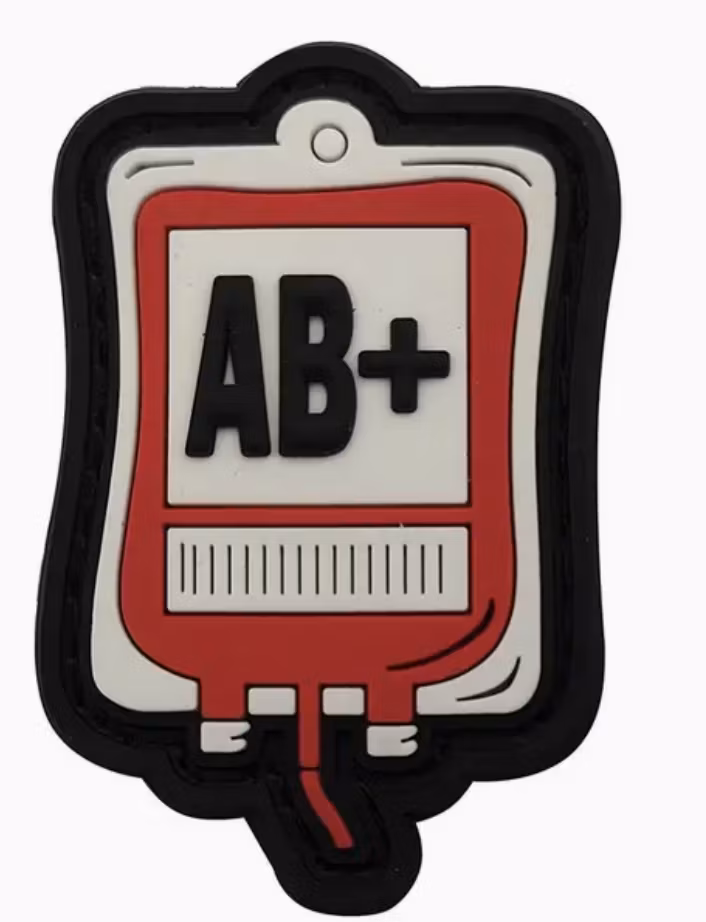 En tydlig och robust blodgruppspatch i vit, svart och röd  – framtagen för att ge snabb och visuell information i nödsituationer. Idealisk för militär, blå