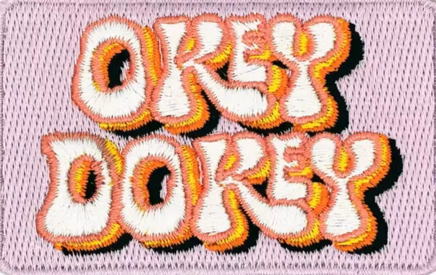 Det här charmiga och avslappnade tygmärket med texten "Okey Dokey" är ett perfekt sätt att lägga till lite humor och lättsamhet till din utrustning eller k