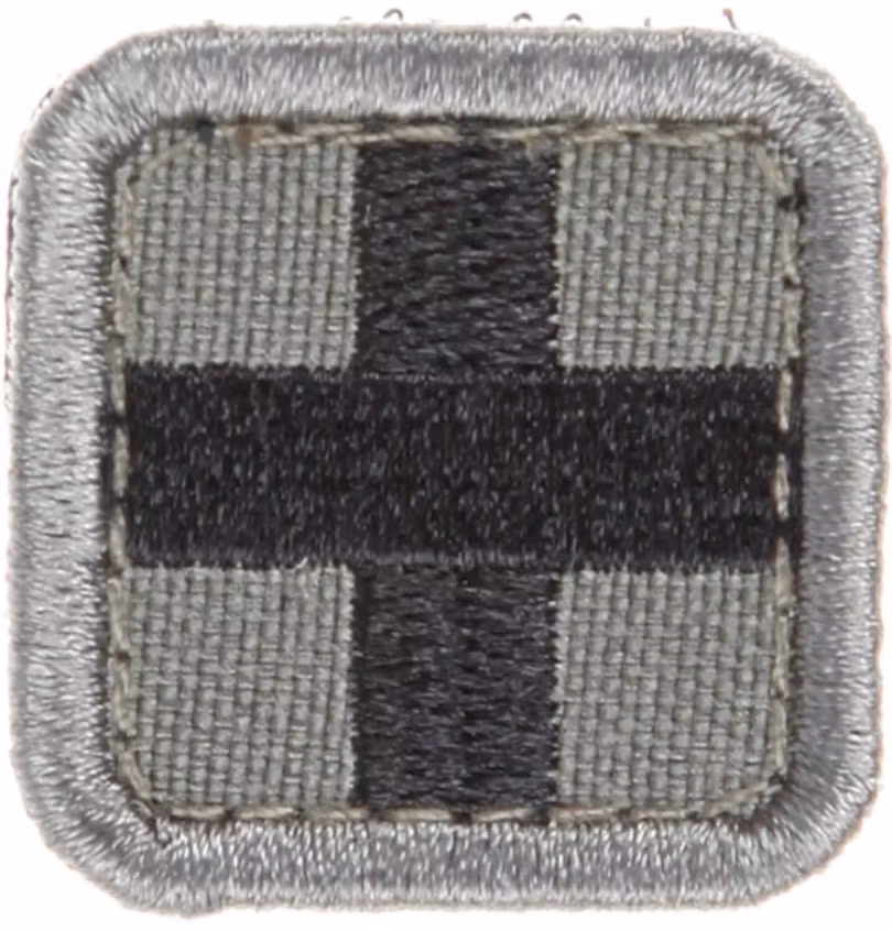 Snigel Cross Patch, Small -12 är en kompakt patch med måtten 25 x 25 mm, designad för att markera medicinsk kompetens på väskor eller fickor. Den har en kardbor