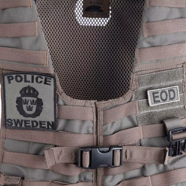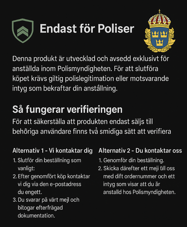 - Tydlig identifiering: Texten "POLICE SWEDEN" och polisymbol för enkel igenkänning.
