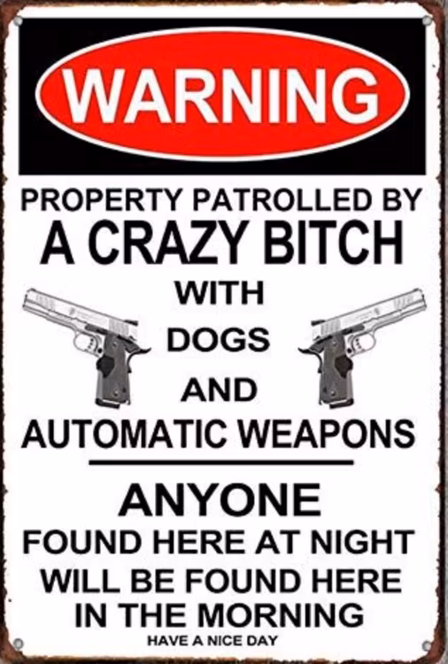 Warning - Property patrolled by a crazy bitch with dogs and automatic weapons - Anyone found here at night will be found here in the morning - Metal tin sign