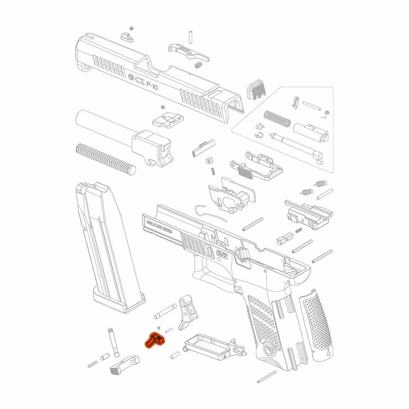 Original avtryckarsäkring i polymer för CZ:s populära P-10-serie (ej P-10 M). Denna komponent är en viktig del i pistolens inbyggda säkerhetssystem och hjälper till att förhindra oavsiktlig avfyrning.