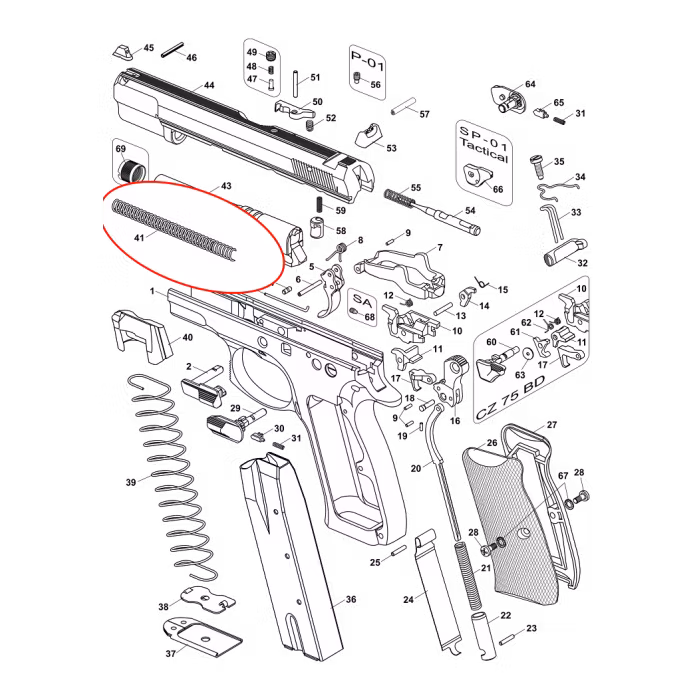 Original rekylfjäder för CZ 75B, 85B, SP-01 och Shadow 2. Perfekt passform, hög hållbarhet och optimal prestanda för tävling och träning.