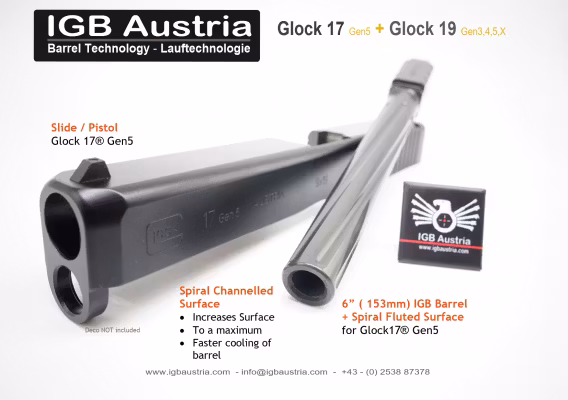 FitsGlock 17 Gen5 / Glock 19 alle Gen.Caliber:9x19Inner Profile:IGB Field/GrooveTwist Rate:1:16 "OA-Length:153 mm ( 6.0" )Material:IGB Superior Barrel SteelHard
