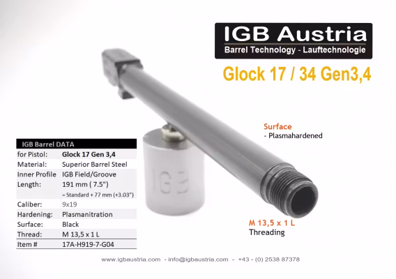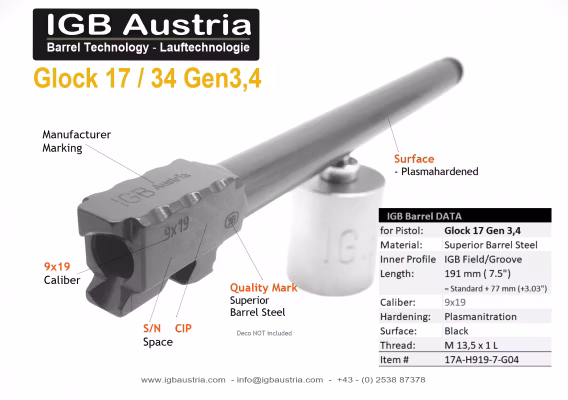 FitsGlock 17 Gen3/4Glock 34 Gen3/4Caliber:9x19Inner Profile:IGB Field/GrooveTwist Rate:1:16 "OA-Length:191 mm ( 7.5" )Glock 17 = Standard + 77 mm ( +3.03")Glock