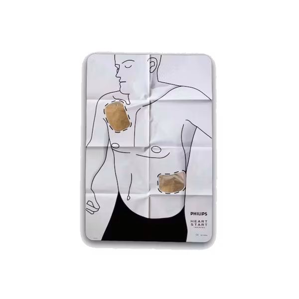 Plansch som tydligt visar korrekt placering av elektroder med Philips HS1/FRx övningshjärtstartare på vuxen.