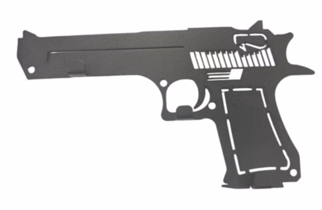 Denna Hanger Pistol LS - Left Side är en robust och elegant hängare speciellt designad för att förvara din pistol säkert och lättåtkomligt. Tillverkad av hållbar 2 mm stålplåt och pulverlackerad i matt svart för en stilren finish, är denna hängare perfekt för montering på vänster sida, anpassad för både skjutbanor och hemmabruk.