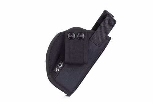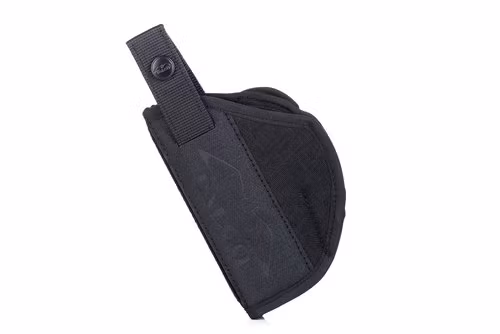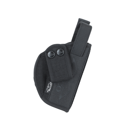 The holster offers good concealability with the added security provided by an adjustable thumb break with strap traps which prevents loss of the strap detached