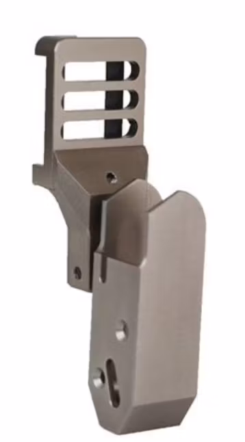 The achieves its height adjustment by means of a rail built directly into the side of the holster body itself. This offers an extended range of adjustment and again reduces torque and forces applied. Here too the lock up is achieved by an expanding dovetail mechanism that does not gouge or damage the rail.