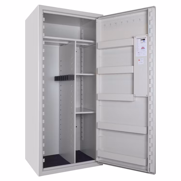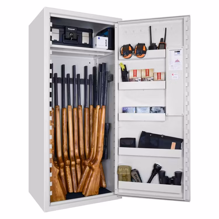 Godkänd och certifierat säkerhetsskåp enligt SSF3492.Väger över 150 kg.Ett av våra största vapenskåp.Förvaring med plats för upp till 20 st gevär.Fem hyllfack i