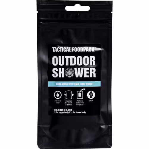 Outdoor Shower är en innovativ utomhustvättlösning. Om du är i en situation där det råder brist på vatten eller någon tvättmöjlighet är det en perfekt och enkel lösning. Den är hudvänlig, icke-sensibiliserande och fri från konserveringsmedel. Produkten innehåller panthenol vilket gör den lämplig att använda även för rengöring av mindre hudskrap eller skärsår.