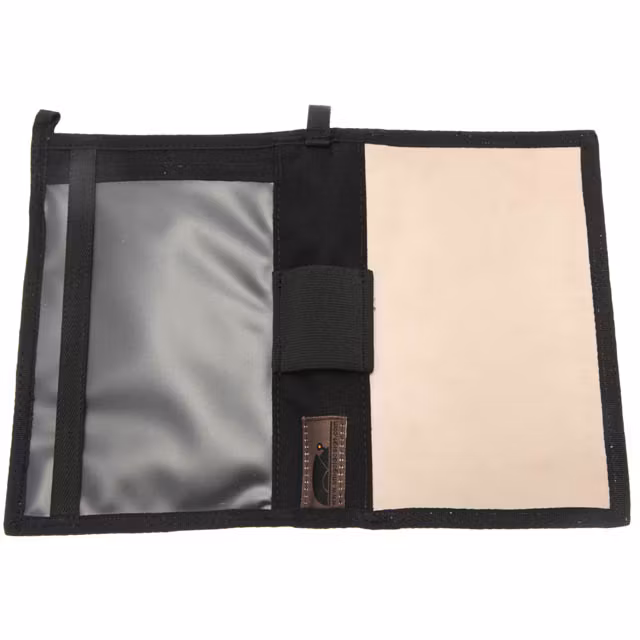 Den är tillverkad av slitstark plast som är helt vattentät och klarar krävande förhållanden. Skyddet har en elastisk stängning som är både tyst och mer hållbar än kardborreband. Inuti finns plats för två pennor och en tablett där du kan skriva viktig information med en blyertspenna, som enkelt kan suddas bort med en våt finger.