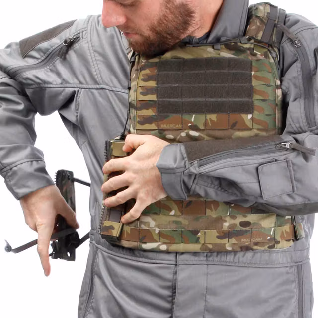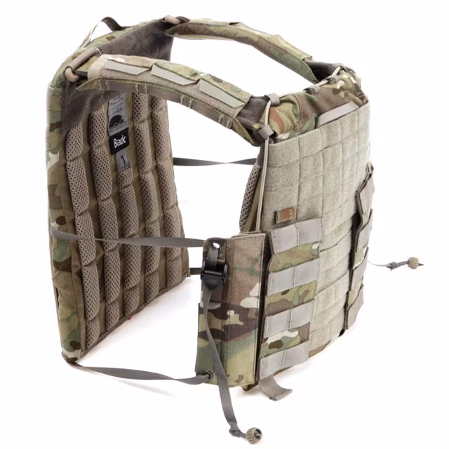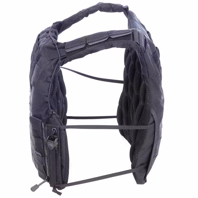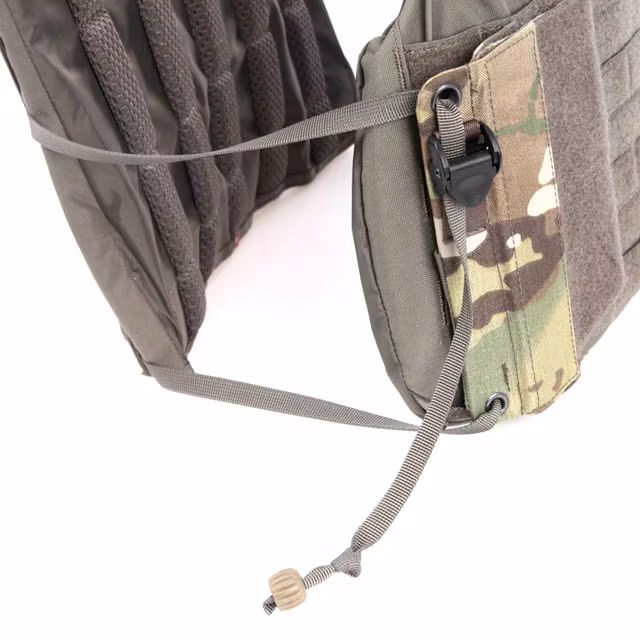 Ett ventilerat alternativ för din Squeeze plate carrier. Konstruktionen består av ett 10 mm brett band (webbing) som fästs framtill med en dragkedja. När du drar i änden av bandet spänns plate carriern åt runt kroppen. Designen lämnar sidorna öppna för ökad ventilation, men ger dig ändå möjlighet att fästa fickor på de webbingremmar som löper längs sidorna. Du kan enkelt skjuta fram eller bak fickorna vid behov.