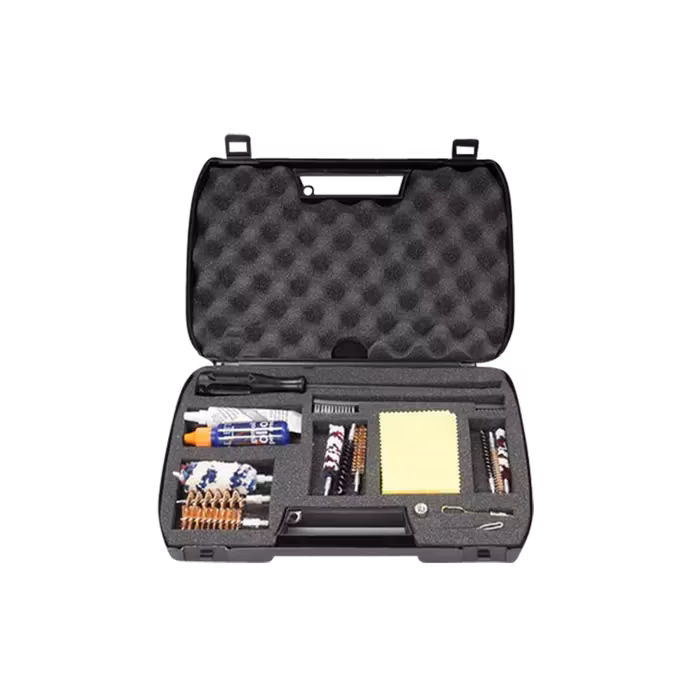 Detta Universal Cleaning Kit är ett exklusivt E-STORE-kit utformat för att passa de vanligaste kalibrarna: 12 gauge, 9 mm och .22 LR. Allt du behöver för grundlig rengöring och underhåll av ditt vapen ingår i ett smidigt, bärbart etui.