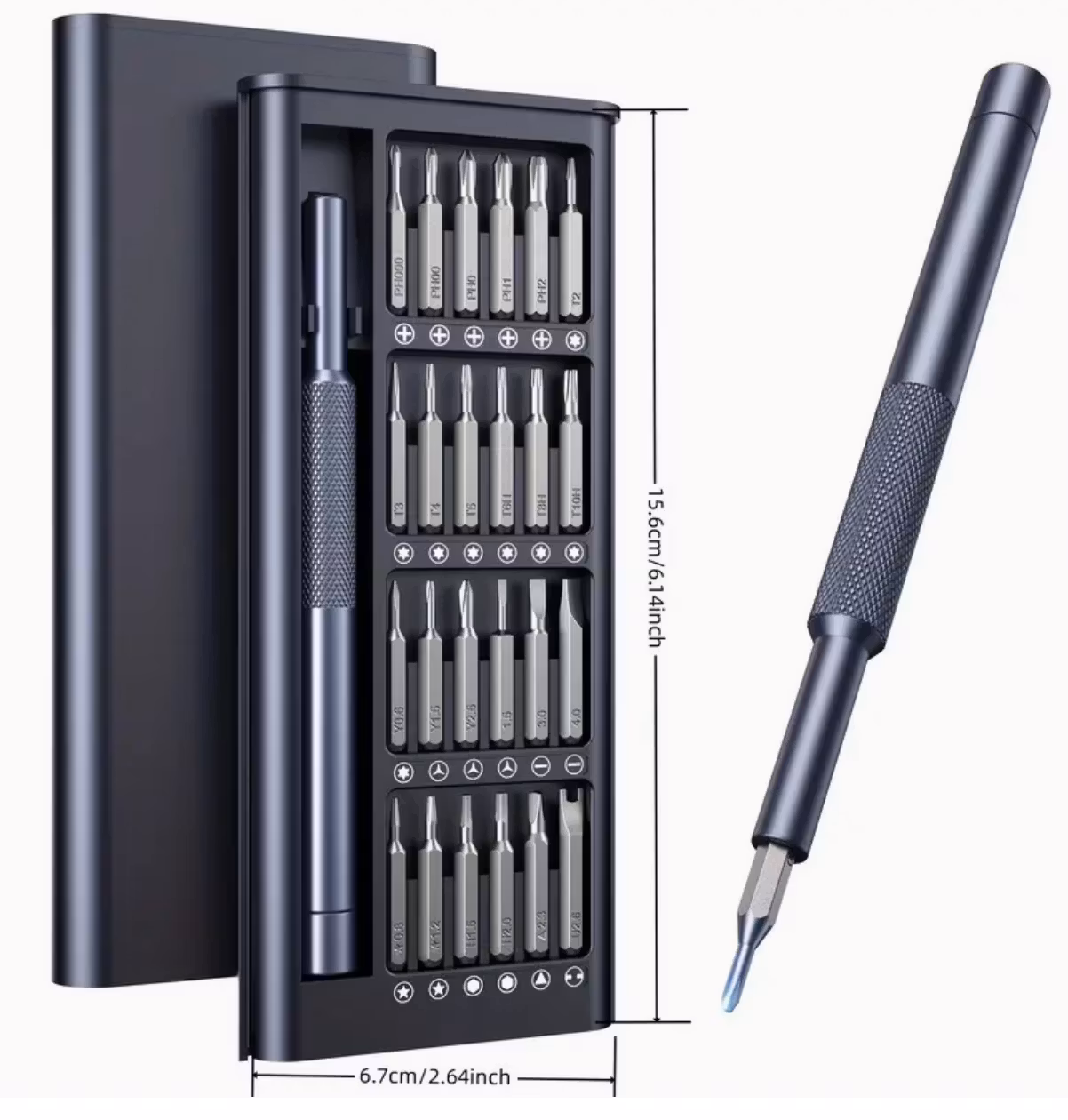 Precisionsskruvmejselset 25-i-1 är ett kompakt och professionellt verktygskit för reparation och precisionsarbete. Setet innehåller ett brett urval av magnetiska bits i flera typer som Torx, Triangulär och Phillips – perfekt för finmekanik. Tillverkat i högkvalitativt S2-stål för maximal hållbarhet och precision.